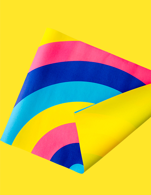 Double-sided print, with a bold rainbow print and a flood of neon yellow on reverse.